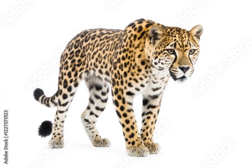 © Zahra, Obraz premium Majestic leopard strides on white backdrop