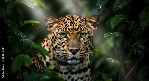 © Aoi, Naklejka premium Majestic leopard with glowing green eyes peering through jungle leaves wildlife predator feline spots nature jungle