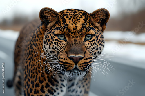 © Nadiyah, Naklejka premium Majestic leopard with piercing blue eyes, walking on a road.
