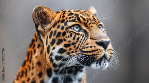 © SerPhoto, Obraz premium Majestic leopard with striking blue eyes poses gracefully in its natural habitat under soft daylight