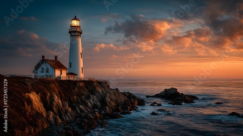 © horizon, Naklejka premium Majestic lighthouse on a rocky coast at sunset, its bright light shining over the ocean as the sky glows in gradients of orange, yellow, and blue.