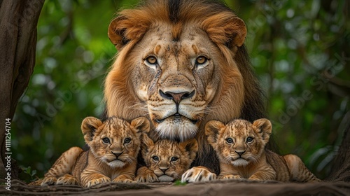 Fototapeta premium Majestic Lion and Playful Lion Cubs Relaxing Together in a Lush Green...