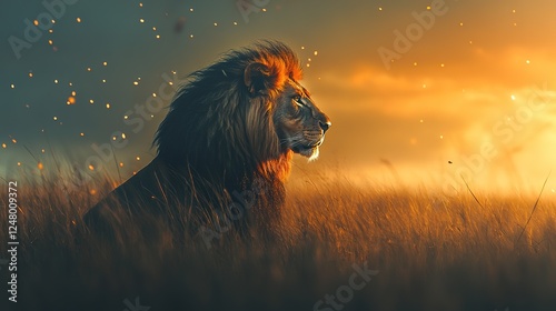 Naklejka premium Majestic Lion at Sunset in Golden Grassland