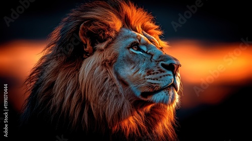 © RONNY, Fototapeta premium Majestic lion at sunset, profile view.