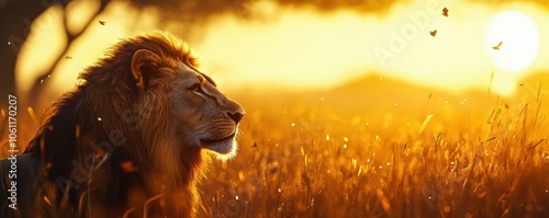 Naklejka premium Majestic lion basking in a golden sunset