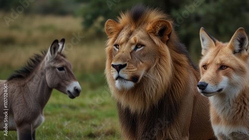 Fototapeta premium Majestic lion, donkey, and fox together in a field.