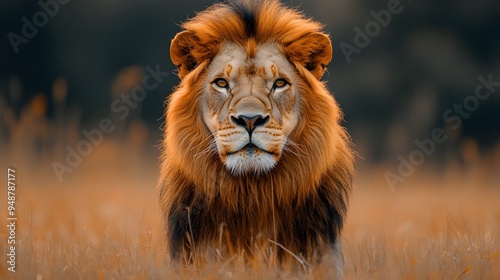 Obraz premium Majestic lion gazing in the savannah, golden mane flowing in the breeze,...
