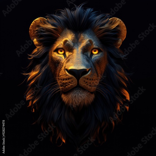 Fototapeta premium Majestic lion head, glowing eyes, dark mane, 3D render.