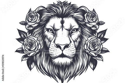 Fototapeta premium Majestic lion head, roses, tattoo design, white background, graphic art