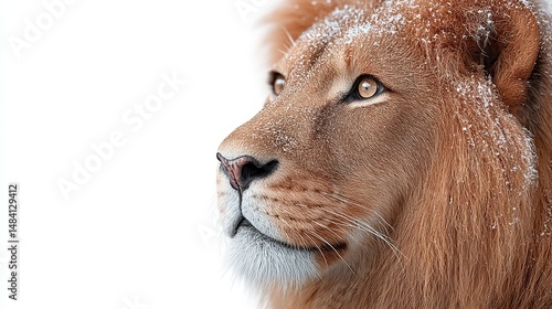 © Narongsag, Obraz premium Majestic Lion in Winter Snow Dusted Mane Close Up Profile