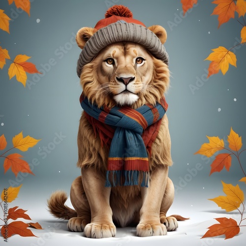 Obraz premium Majestic Lion in Winter Wonderland: A Cozy Autumnal Portrait of a King