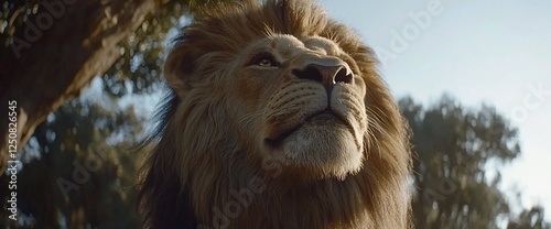 © ABIDZAR ALFAREZ, Fototapeta premium Majestic Lion Looking Up, Sunny Savannah Background, Wildlife