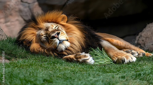 Naklejka premium Majestic Lion Napping in the Grass, male lion, african lion, sleeping lion,...