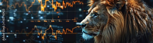© Nisit, Naklejka premium Majestic lion overlay with stock market graphs