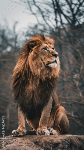 © Maestro, Naklejka premium Majestic lion perched on a rock in a serene forest setting during early morning light