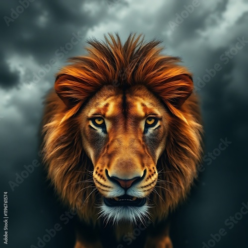 © Fulan, Naklejka premium Majestic lion portrait against stormy sky.