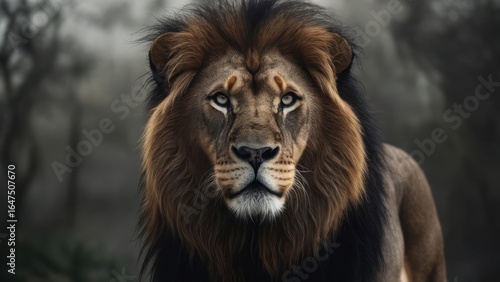 © Adi, Fototapeta premium Majestic lion portrait in a misty forest