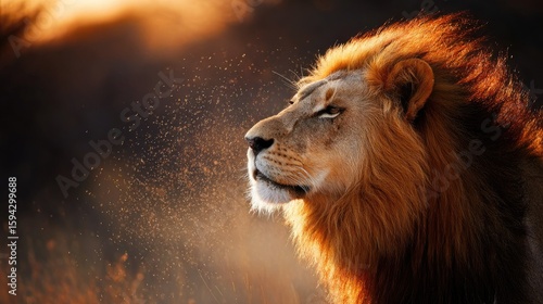 © Alokya, Fototapeta premium Majestic lion portrait in golden light.