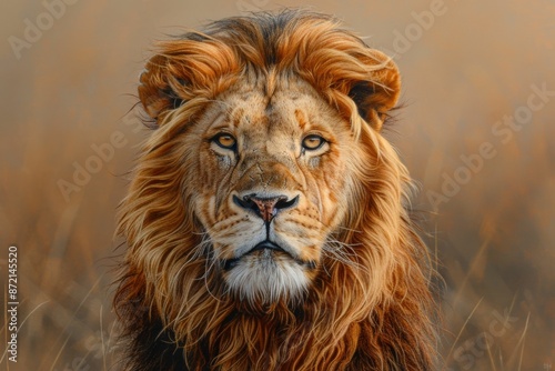 © AIPhoto, Obraz premium Majestic Lion Portrait in Natural Habitat with Golden Mane and Intense Gaze