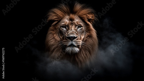 Fototapeta premium Majestic lion portrait in smoky darkness.