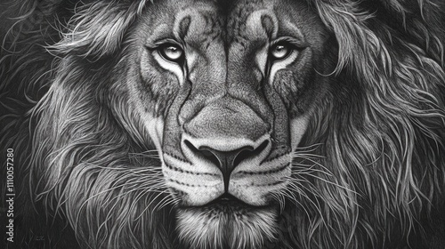 © Windi, Fototapeta premium Majestic lion portrait, monochrome, intense gaze, detailed mane.