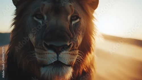 Fototapeta premium Majestic lion portrait, sunset dunes, African safari, wildlife documentary