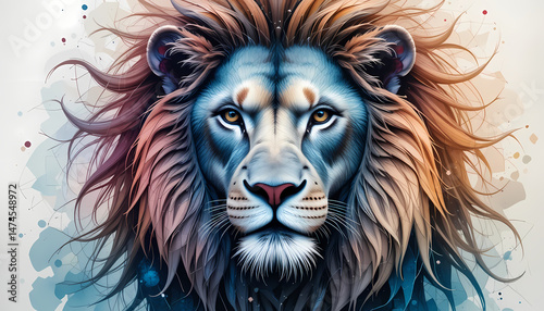 © dapra01, Naklejka premium Majestic Lion Portrait with Artistic Watercolor Style and Bold Colors