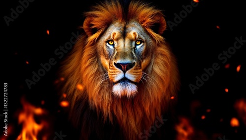© Laodefardin, Fototapeta premium Majestic Lion Portrait with Fiery Background Powerful Animal Image