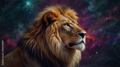 © Lycee, Naklejka premium Majestic Lion Profile Against Cosmic Nebula Background
