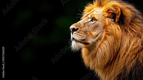 © JK_kyoto, Fototapeta premium Majestic lion profile showcasing its vibrant mane and fierce expression against a dark background.