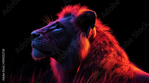 © peppastocker, Naklejka premium Majestic lion profile under colorful lighting. Generative AI image