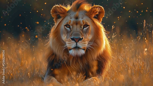 Fototapeta premium Majestic lion resting in golden grass during sunset, with soft light and...