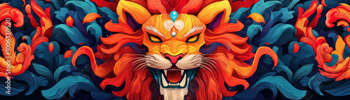 © Cheetose, Fototapeta premium Majestic lion roaring amidst vibrant colors, symbolizing strength and celebration. intricate design showcases blend of fiery hues and flowing patterns, evoking sense of power and festivity