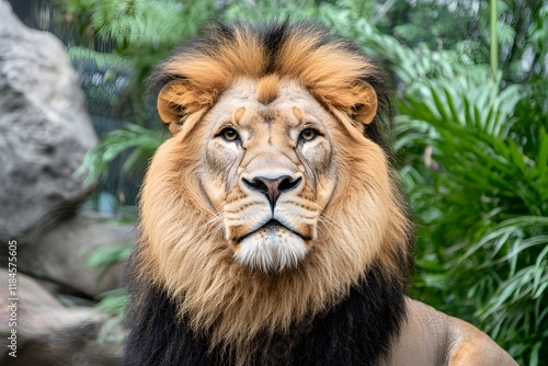 © enter, Naklejka premium Majestic Lion's Portrait: Wild Cat in Lush Greenery