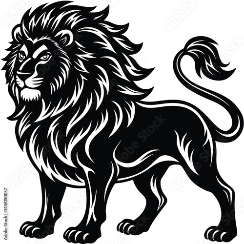 Fototapeta premium Majestic Lion Standing, Thick Mane, Detailed Black and White Art