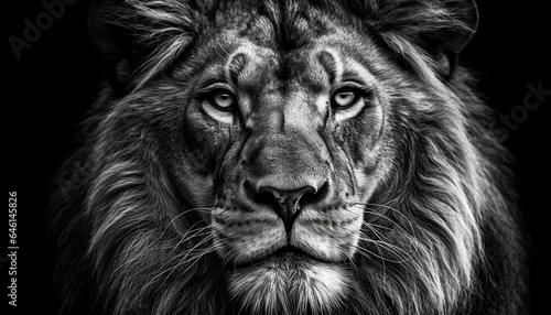 Naklejka premium Majestic lion staring at camera, watching with intense beauty generated by AI