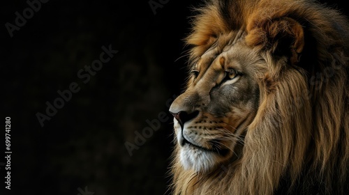 © Mohammad, Fototapeta premium Majestic Lion staring on black background, motivational quote inspirational male grind post, Stoicism stoic hard men mentality philosophy philosopher, copy space for quotation text