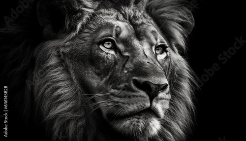 © Stockgiu, Naklejka premium Majestic lion staring, teeth bared, in black and white portrait generated by AI