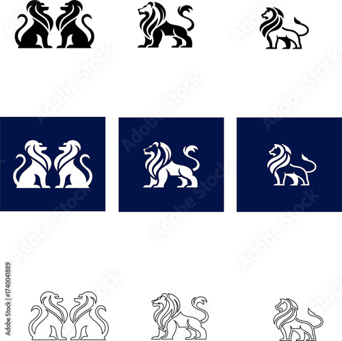 © Muhammad, Fototapeta premium Majestic lion vector icons in silhouette and outline styles, perfect for adventure branding, tribal artwork, and corporate logos.