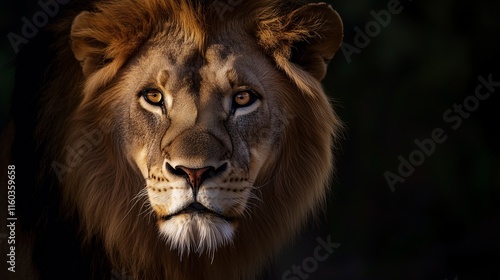 Naklejka premium Majestic lion with a piercing gaze in dramatic low light.