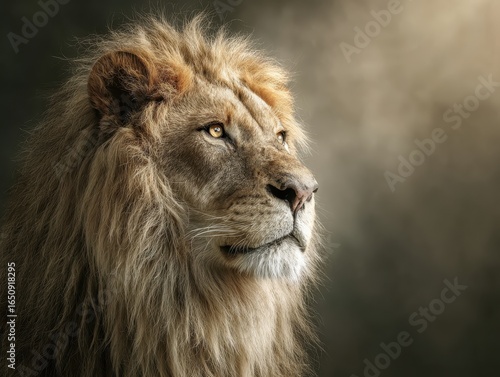 © sami, Fototapeta premium Majestic Lion with Golden Mane in Intense Stare, Against Ethereal Savannah Backdrop