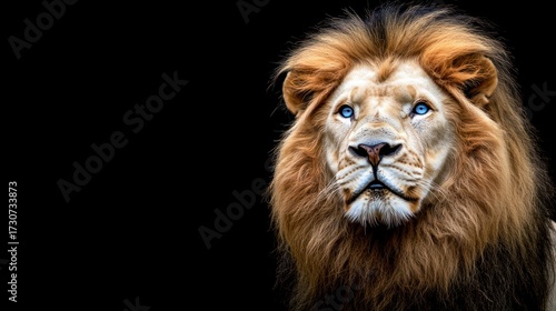 Fototapeta premium Majestic lion with striking blue eyes gazing intently against a black...