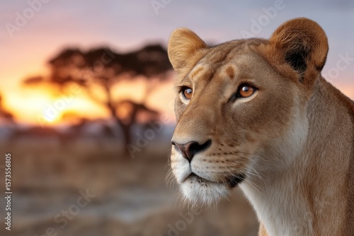 Fototapeta premium Majestic lioness at sunset in african savannah