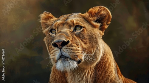 Fototapeta premium Majestic lioness resting in the wild savanna under the golden sun, showcasing...