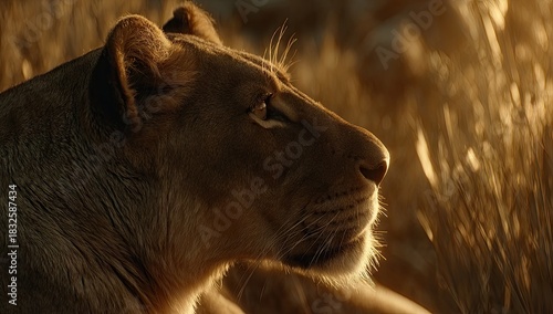 © mlion, Naklejka premium Majestic lioness rests in golden grasses at sunset.