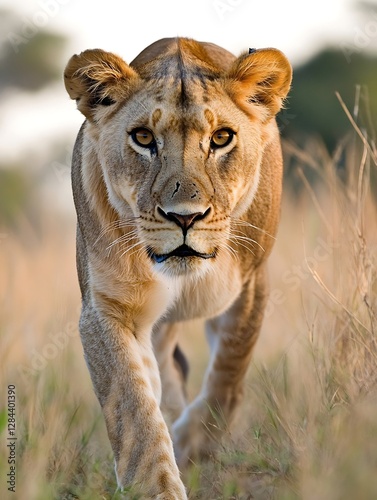 © Generative AI, Obraz premium Majestic lioness walking confidently through tall grass under a clear blue sky : Generative AI
