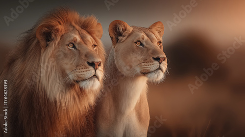 © KAZI DESIGN, Obraz premium Majestic Lions in Golden Hour Light - A Symbol of Strength and Royalty