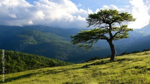 Fototapeta premium Majestic Lone Tree Standing Proudly on a Rolling Hill with Vibrant Greenery...