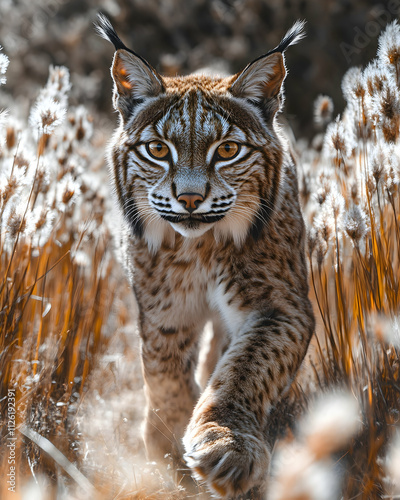 Obraz premium Majestic lynx walking towards camera in tall grass.