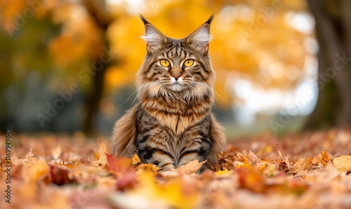 Fototapeta premium Majestic Maine Coon cat amidst autumn leaves. (1)